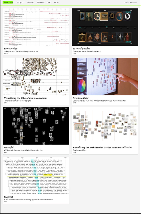 Olivia Vane hat sich in ihrer 2019 veröffentlichten Dissertation Timeline Design for Visualising Cultural Heritage Data36 ebenfalls mit der Visualisierung von Daten aus digitalisierten Sammlungen von Museen, Archiven und Bibliotheken in interaktiven Zeitstrahlen befasst. Während Florian Kräutli den Fokus auf den Zeitstrahl als Tool zur Analyse von digitalen Sammlungen gelegt hat, steht bei Olivia Vane der Zeitstrahl als Übermittler von Narration im Vordergrund. Sie hat den Schwerpunkt auf das Konzept von Narration in und durch Zeitstrahle gelegt sowie auf die Darstellung von Unsicherheit bei der Visualisierung von Zeit.