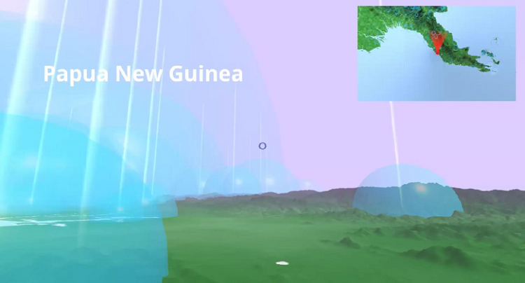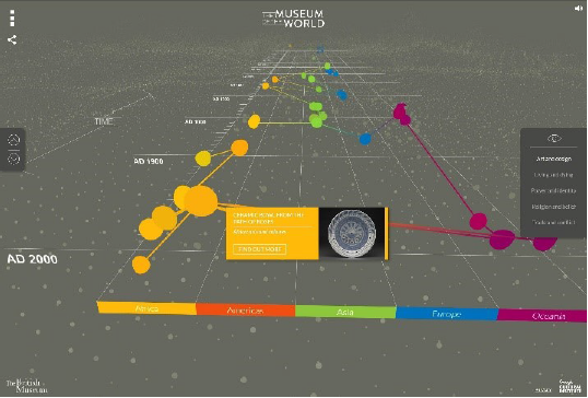 Neben flachen Interfaces auf einem Bildschirm weisen virtuelle Umgebungen ein räumliches Interface auf, das einen dreidimensionalen Zugang zu kulturellen Daten ermöglicht. Bei Glossopticon VR können mit einem VR-Headset historische Audioaufnahmen von über 1500 Sprachen aus dem Pazifikraum erkundet werden. Damit wird ein Zugang zur Sammlung von linguistischen Archivdaten des Pacific and Regional Archive for Digital Sources in Endangered Cultures (PARADISEC) geschaffen. Die Anwendung wurde sowohl als Forschungstool als auch für eine Ausstellung, und damit für eine breite Öffentlichkeit, entwickelt. In der Anwendung lokalisieren Lichtsäulen die einzelnen Sprachen auf einer dreidimensionalen Karte, dabei korrespondiert die Grösse der halbtransparenten Halbkugeln mit der Anzahl Sprechenden; zusätzlich werden weiterführende Angaben eingeblendet. Beim Navigieren durch die virtuelle Umgebung werden verschiedene Soundfiles ausgelöst und parallel abgespielt, sodass ein Klangteppich aus verschiedenen Stimmen erkundet werden kann.73 Das Besondere an diesem Beispiel ist nicht nur, dass es für die Informationsvisualisierung auf Virtual Reality Technologie setzt, sondern aufzeigt, dass auch abstrakte Daten wie Audiospuren visualisiert werden können. Zudem wird deutlich, dass Interaktion bei Tondokumenten auch anders gestaltet sein kann, als diese in einem Player als einzelne Audiostreams abzuspielen. Der Programmcode steht zur Nachnutzung in eigenen Projekten zur Verfügung.74
