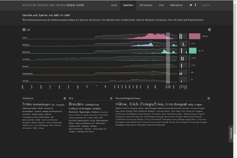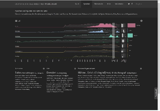 Stichwörter in den Word Clouds, die weissen Säulen und die Bunten Balken führen mit einem Klick zum klassisch aufgebauten Suchportal der Deutschen Digitalen Bibliothek. Dort werden direkt diejenigen Datensätze als Suchresultat angezeigt, die der Auswahl entsprechen, die zuvor mit den vorhandenen Filtermöglichkeiten in der Visualisierung vorgenommenen wurde. Der Zeitstrahl dient in dieser Visualisierung als Indiz, um den Medienbestand in seiner Quantifizierung darzustellen. Ziel ist, wie Marian Dörk, Christopher Pietsch und Gabriel Credico festhalten, unterschiedliche Blickwinkel zu eröffnen, weil eine einzige Visualisierung die Komplexität einer kulturellen Sammlung nicht wiedergeben kann. 41 Die Visualisierungen sollen nach Kathrin Glinka, Sebastian Meier und Marian Dörk auch genutzt werden, um nicht direkt sichtbare Zusammenhänge darzustellen und konfligierende Narrative zu verdeutlichen.42