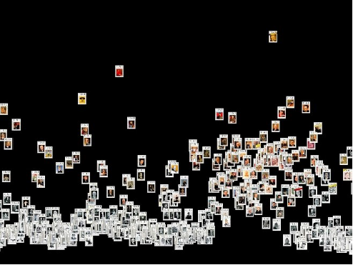 Ordnungen lassen sich mit Bilddaten beliebiger Objekte in unterschiedlichsten Arrangements erstellen. Die Anordnung in einem Raster wie im obigen Beispiel von Lev Manovich und damit das Aufspannen eines Bilderteppichs zwischen einer unsichtbaren Xund Y-Achse ist nur eine Möglichkeit. Eine andere Möglichkeit ist, aufgrund bestimmter Kategorien in den Metadaten, Cluster zu bilden.