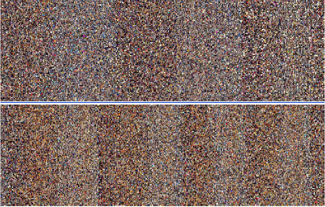 Zur Erforschung grosser Bildersammlungen arbeitet Lev Manovich mit Plots, die einzelne Bilder nach bestimmten Schemata anordnen. Dadurch werden Strukturen sichtund fassbar, die kulturelle Aussagen über ganze Bildkorpora erlauben. Bei Phototrails, an diesem Projekt waren zudem Nadav Hochman und Jay Chow beteiligt, wurden Fotografien von Instagram verwendet, die in New York und in Tokio hochgeladen wurden. Die Fotografien sind in der Reihenfolge des Uploads (oben gegen unten) und nach Veröffentlichungszeit (links nach rechts) geordnet, so dass die zu unterschiedlichen Tageszeiten hochgeladenen Fotos als Bänder sichtbar werden.46 Im Vergleich der beiden Plots wird deutlich, dass der Farbton der beiden Städte leicht voneinander abweicht und eine unterschiedliche Frequenz von ungleich breiten Bändern auftritt. Welche sozialen Bedingungen hinter dem beobachteten Effekt stecken, muss bei näherer Betrachtung der einzelnen Fotos untersucht werden. Eine Rolle spielt sicherlich das aufgenommene Objekt und ob die Aufnahmen in geschlossenen Räumen, unter freiem Himmel, bei Tag oder bei Nacht gemacht wurden. Davon ausgehend lassen sich Aussagen darüber treffen, in welchen Städten beispielsweise das Nachtleben besonders ausgeprägt ist und zudem dokumentiert wird, oder wo eher andere Objekte und Themen ins Gewicht fallen, wie beispielsweise die Abbildung von Speisen, Landschaften oder Personen (auch Selfies).