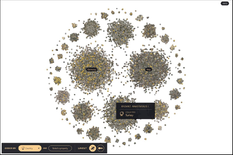 Besonders gelungen und mehrfach prämiert ist die Visualisierung historischer Münzen, Coins, die am Urban Complexity Lab der Fachhochschule Potsdam in Kollaboration mit dem Münzkabinett Berlin entstanden ist: Rund 26000 Münzen aus dem Münzkabinett können mit verschiedenen Layouts und Filtern arrangiert und interaktiv erkundet werden. Der Gesamtbestand der Münzen kann so beispielsweise in nach Ländern sortierte, kleinere Haufen aufgeteilt werden. Auf diese Weise werden konventionelle Displays der Präsentation von Münzen im Museumskontext aufgebrochen. In einer Ausstellung im Museum steht üblicherweise die einzelne Münze, ihre Beschaffenheit und das darauf abgebildete Motiv im Vordergrund. Daneben bestehen digitale Sammlungspräsenzen in den meisten Fällen aus einer durchsuchbaren Datenbank, die aus einer Abbildung des Objekts und Objektinformationen (Bezeichnung/Titel, Datierung, Material, Masse usw.) bestehen. Die einzelnen Münzen in Coins sind ebenfalls mit zusätzlichen Informationen (wie Land, Material, Durchmesser, Gewicht oder Datierung) zur näheren Bestimmung verknüpft. Das sind jedoch ausgewählte Kategorien, die vor allem deshalb vorhanden sind, weil sie auch zum Durchstöbern, Arrangieren und Filtern der Sammlung verwendet werden. Bei Interesse an ausführlichen Informationen zu einer einzelnen Münze wird man jedoch direkt aus der Anwendung heraus zum entsprechenden Eintrag im Interaktiven Katalog des Münzkabinetts47 weitergeleitet. Die 2018 mit dem Information is Beautiful Award