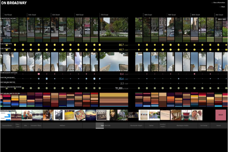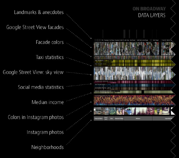 Mit On Broadway wird die Grenze der Visualisierung von Bildern überschritten, indem von Manovich zusätzliche Datenpunkte mit dargestellt wurden, etwa Daten