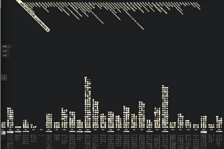 Weitere Formen von Plots haben Katrin Glinka, Christopher Pietsch und Marian Dörk mit der Anwendung Vergangene Visionen – auch unter dem englischen Titel Past Visions bekannt – vorgestellt. Dort wird die Anordnung von Zeichnungen über einem Zeitstrahl in der Kombination mit Metadaten dynamisch angepasst.51 Zeichnungen von Friedrich Wilhelm IV. aus der Graphischen Sammlung der Stiftung Preußische Schlösser und Gärten Berlin-Brandenburg werden nach Entstehungsjahr mit kleinen Vorschaubildern in einer Art Säulendiagramm dargestellt. Je grösser ein Begriff am oberen Rand angezeigt wird, desto häufiger kommt er als Schlagwort in den Metadaten von Zeichnungen vor. Gleichzeitig dienen diese Begriffe als Filter. Wird eines dieser Schlagwörter angeklickt, fallen alle digitalen Objekte, die dieses nicht enthalten, unter den Zeitstrahl und werden ausgegraut. Wird in die Darstellung