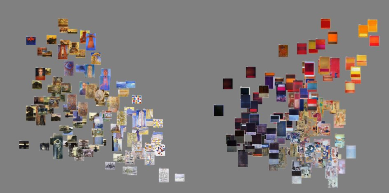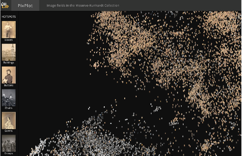 «herkömmliches» machine learning, das Vektorisierungen und/oder Vergleiche vornimmt. Im Textbereich wurde oben bereits Topic Modeling (wie oben wieder im Sinne von LDA) beschrieben, ein Lernverfahren, das als ein Resultat ein Dokumenten-Clustering ausgibt. Umgemünzt auf Bilder können diese als Vektoren umgerechnet werden, um Ähnlichkeiten darzustellen. Als Beispiel kann hier imgs.ai hingewiesen werden, ein Projekt von Fabian Offert, Olga Harlamov und Peter Bell, in dem Bilder aufgrund von Ähnlichkeiten auf unterschiedlicher Basis (Pixel, Pose, etc.) verglichen werden können. 102 Auf einer ähnlichen Ausgangslage beruht PixPlot des DHLab der Universität Yale. Die Bilder aus einer Sammlung werden in Form von Miniaturansichten aufgrund von Ähnlichkeiten in Clustern visualisiert und durch Zoomen erforschbar.103