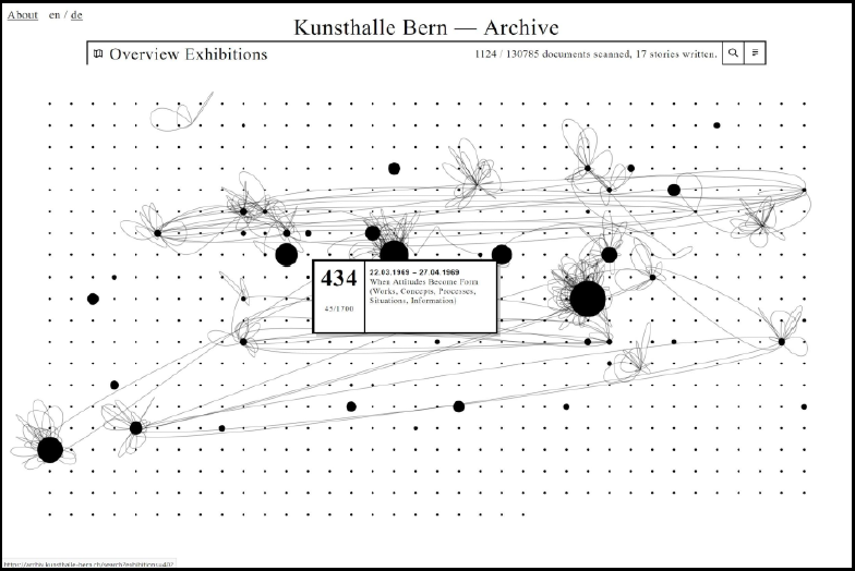 Einen besonderen Weg geht die Kunsthalle Bern mit ihrem Archiv, das seit Juli 2018 online ist.57 Eine interaktive Datenvisualisierung zeigt laufend an, welche Dokumente aus den über 700 Ausstellungen, die seit der Eröffnung der Institution 1918 gezeigt wurden, bereits digitalisiert vorhanden sind. Forschende, die das Archiv zu Recherchezwecken besuchen, werden von der Kunsthalle Bern aufgefordert, an einem bereitgestellten Arbeitstisch mit einer installierten und über ein Computer-Interface gesteuerten Kamera digitale Abbildungen der benötigten Dokumente anzufertigen und die wichtigsten Metadaten zu erfassen.58 Die Archivbesuchenden stellen damit nicht nur zu ihren eigenen Zwecken Reproduktionen her, sondern digitalisieren sie so, dass sie in guter Qualität auch weiteren Nutzenden zur Verfügung stehen. Die Digitalisierung erfolgt also schrittweise und wird gleichzeitig über die Website für Externe sichtbar gemacht, die zunehmend einen grösseren Einblick ins Archiv der Kunsthalle erhalten. Die Punkte in der Visualisierung stehen für die einzelnen Ausstellungen und wachsen an, je mehr Dokumente digital vorliegen. Verbindungslinien stellen die Forschungsbzw. Rechercheinteressen einzelner Archivnutzender dar. Die digital vorhandenen Dokumente können direkt über die Visualisierung aufgerufen und eingesehen werden.