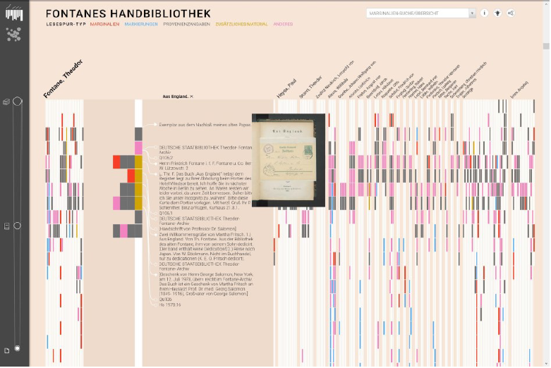 Dieser Ansatz wird von Viktoria Brüggemann u. a. beschrieben, die vor allem explorative Aspekte und zufälliges Auffinden über Möglichkeiten der Betrachtung aus Distanz und Nähe formulieren.60 Anhand der Handbibliothek Theodor Fontanes wird eine Kombination von Zugriffen ebenfalls durch das UCLAB (Jan-Mark Bludau