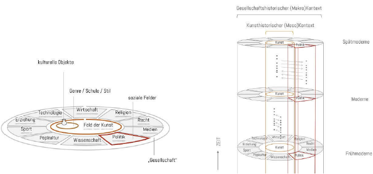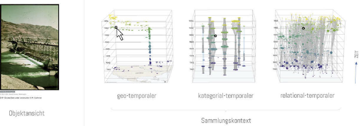«synoptische Optionen der Kontextualisierung von Objekten innerhalb einer Sammlung« untersucht. Multiperspektivische Ansichten bilden ein Interface, das mehrere Datendimensionen von Objekten gleichzeitig darstellt. Das PolyCube-System kombiniert geo-temporale, kategorial-temporale und relational-temporale Perspektiven mit nahtlosen Übergängen zur Darstellung einer kulturellen Sammlung, wodurch ein Verständnis von komplexen Kontextualisierungen möglich wird. Im Rahmen der Forschungen zu PolyCubes wurde festgestellt, dass Sammlungsinterfaces makroskopische Kontextualisierungen vorwiegend mit Blick auf eine Sammlung ermöglichen. Mit PolyCube sollen aber nicht nur die in einer Sammlung enthaltenen Objekte selbst in den Fokus kommen, sondern Informationen und Kontext (allgemein aus dem Web oder aus anderen Sammlungen) miteinbezogen werden. Gerade in der Verweisstruktur von kulturellen Objekten steckt das Potenzial, diese Informationen im Digitalen zu verknüpfen und die Daten in einem semantischen Netz zu strukturieren, das als Grundlage für Visualisierungen und Interfaces dient. In Bezug auf Kunstsammlungen unterscheiden sie eine biografische, eine kunsthistorische und eine makrohistorische Kontextualisierung. Für eine polykontextuale Visualisierung bedeutet das also, dass neben der Werkanalyse mit Bezug auf das Künstlerleben und der Verortung eines Objekts in grösseren kunsthistorischen Entwicklungssträngen auch parallele gesellschaftliche Prozesse (z. B. in Politik, Medien, Religion, Wirtschaft, Technologie, Kultur oder Wissenschaft) berücksichtigt werden müssen. Daraus entsteht ein Modell, das Übergänge von Close-Readingund Distant-Reading-Perspektiven über mehrere Ebenen miteinander verbindet.70