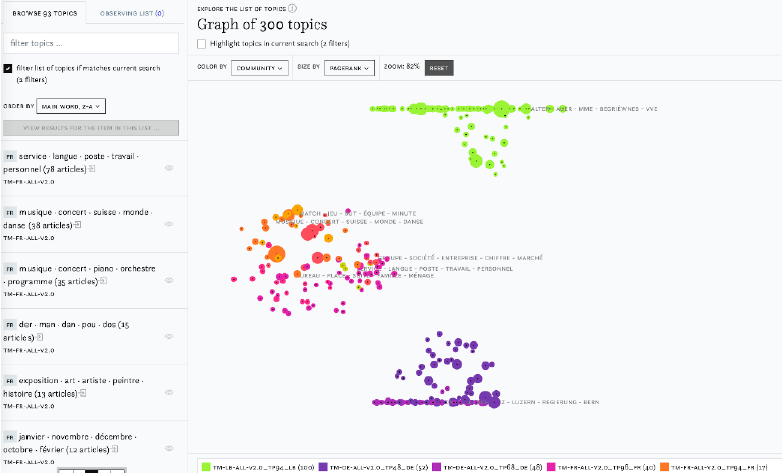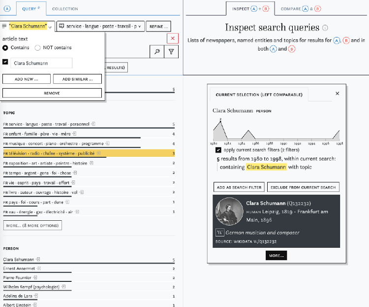 Schliesslich ein weiteres Beispiel für ein Dashboard, das im Frontend zum Interface einer Sammlung wird, ist die weiter unten bei den «Semantischen Zugangsformen» besprochene Impresso-App. Dort werden verschiedene Visualisierungen einsetzt, um im Zeitungsportal Filtermöglichkeiten vorzunehmen und Zusammenhänge erkennen zu können.