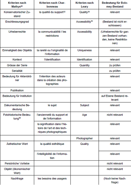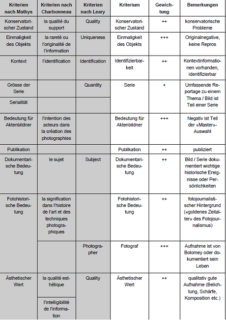 – nach Menne-Haritz definiert als die Entscheidung über Aufbewahrung oder Kassation25 – vor, sondern die ganzen fotografischen Archive werden übernommen und aufbewahrt.26 Eine Bewertung – hier weiter gefasst – findet bei der Erschliessung statt: Wichtige Werkgruppen werden grundsätzlich priorisiert und auf Einzelbildebene erschlossen, während Werkgruppen, die als weniger wichtig eingestuft werden, entweder gar nicht oder in Form von Sammeleinträgen erfasst werden. Obwohl auch beim Bolomey-Bestand keine Kassationen vorgesehen sind,27 spielt daher die Bewertungsfrage eine wichtige Rolle bei der Bestimmung der Erschliessungstiefe. Hierfür dienen die Kriterienkataloge von William H. Leary28, Normand Charbonneau29 und Nora Mathys30, welche für die Bewertung von Fotobeständen entwickelt worden sind, als Grundlage.