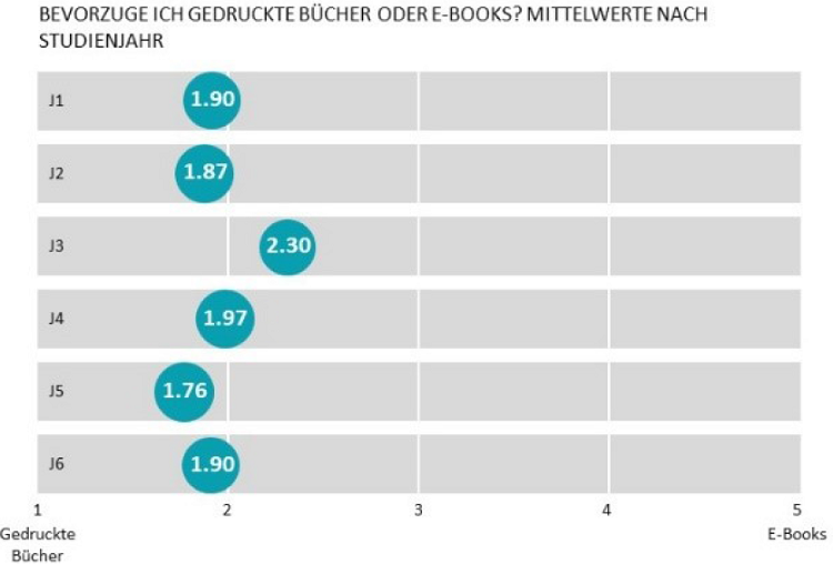 In den quantitativen Resultaten kam eine hohe Bevorzugung von gedruckten Büchern gegenüber E-Books zum Vorschein. Die in den Experteninterviews mehrfach geäus- serte These, dass es sich dabei vor allem um ein Phänomen der unteren Jahrgänge handeln könnte, wird von den vorliegenden Daten nicht gestützt (vergl. Abbildung 9).