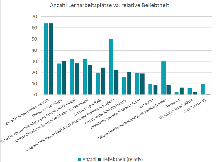 Alle untersuchten Bibliotheken bieten ihrem Publikum mehrere hundert Lernarbeits- plätze an (250 bis 440 Plätze). Entscheidender als die absolute Zahl ist aber oft der sogenannte «Platzfaktor» (Vogel et al., 2019), welcher das Angebot an Lernplätzen zu den Studierendenzahlen ins Verhältnis setzt.