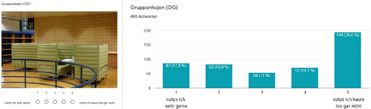 Im qualitativen Teil der Online-Umfrage und in den Fokusgruppen wurde mehrfach zum Ausdruck gebracht, dass sich die Studierenden gewünscht hätten, das Oberge- schoss wäre mehr im Stil des Erdgeschosses gestaltet worden. Obschon die Gruppen- kojen bei einigen sehr beliebt sind, finden andere, dass die Gruppentische vor dem Umbau sinnvoller waren, da sie mehr Plätze boten und auch besser für das Einzeller- nen verwendet werden konnten.