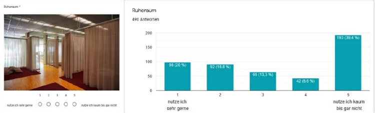 wird ersichtlich, dass er längst nicht von allen genutzt wird. Aus den offenen Antwor- ten geht hervor, dass er bei denen, die ihn nutzen, jedoch hochbeliebt ist. Er wird dort oft angesprochen und als «super», «wahnsinnig toll», «genial» und «grosses Plus» bezeichnet. Negativ erwähnt wird mehrfach, dass es im Ruheraum nicht ruhig genug sei und dass Lärm zu den benachbarten Lernarbeitsplätzen dringe. Hier besteht Hand- lungsbedarf. Ob eine «bessere Beschilderung» wie vorgeschlagen ausreichen wird, ist allerdings fraglich. Eine weiteres etwas überraschendes Ergebnis aus den qualitativen Fragen ist, dass offenbar viele noch nicht bemerkt haben, dass es einen Ruheraum gibt.