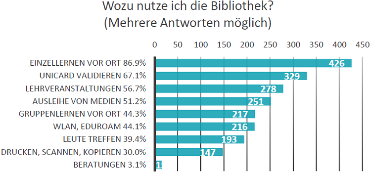 Die Fokusgruppen ermöglichten noch einmal eine andere und ergänzende Per- spektive, da Ergebnisse in der Gruppe diskutiert und erarbeitet werden konnten. Dass frühere Öffnungszeiten am Morgen vor allem erwünscht sind, damit in letzter Minute hochgeladene Folien vor der Vorlesung ausgedruckt werden können, ist ein Beispiel für ein solche durch die Diskussion erlangte Einsicht.