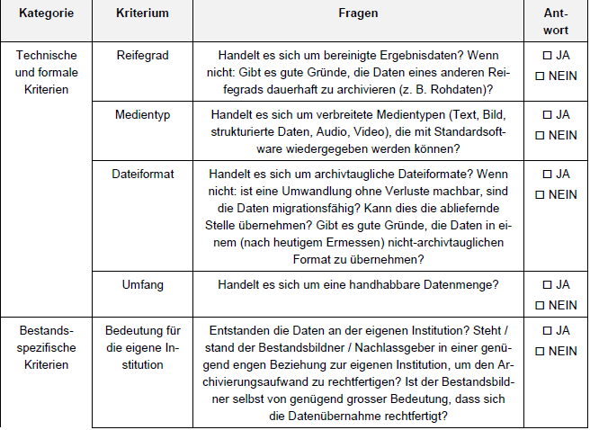 Im Idealfall werden sämtliche Fragen mit Ja beantwortet. Häufen sich Nein-Antwor- ten ist Vorsicht geboten. Entweder fehlen dann die technischen oder inhaltlichen Vo- raussetzungen oder die Machbarkeit ist in Frage gestellt. Die technischen und forma- len Kriterien stützen sich auf die Erkenntnisse zu Forschungsdaten (Kapitel 0). Die bestandsspezifischen und die inhaltlichen Kriterien leiten sich aus der Diskussion zur Archivwürdigkeit von Forschungsdaten in Kapitel 0 ab. Die ökonomischen Kriterien dürfen nicht unterschätzt werden, sind sie doch essentiell für die praktische Umset- zung des Übernahmeprojekts.