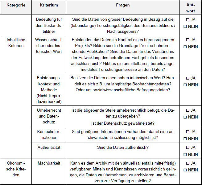 Ob einem Archiv Forschungsdaten angeboten werden oder ob es proaktiv solche über- nehmen möchte: Vor der Datenübernahme muss eine Bewertung erfolgen. Das nach- folgende Frageraster, das auf den Erkenntnissen aus dieser Arbeit basiert, bietet dazu eine Hilfestellung. Mit ihm werden die digitalen Daten geprüft und die Urheberschaft befragt, um beurteilen zu können, ob sich die Daten nach technischen, formalen, in- haltlichen und ökonomischen Kriterien für die Langzeitarchivierung eignen.