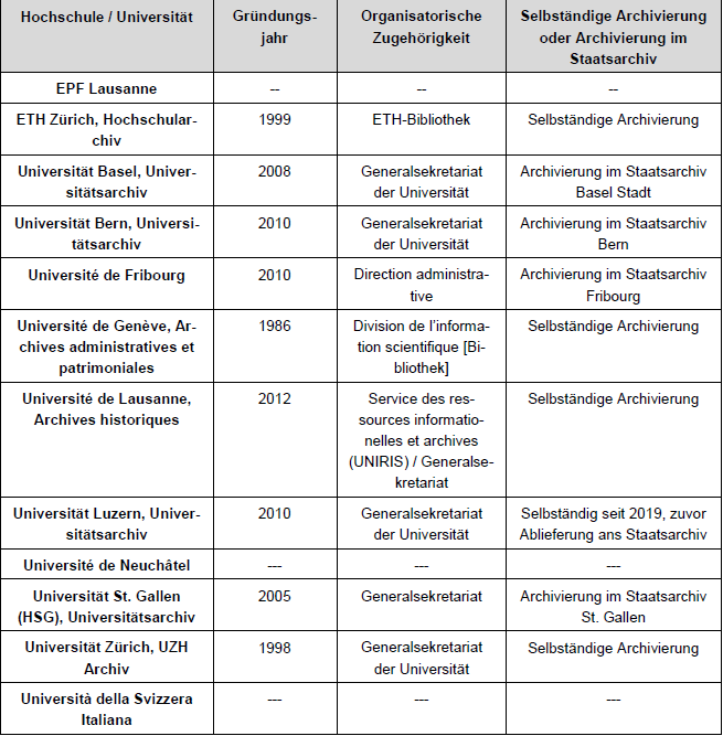 findet. Die EPF Lausanne, die Universität Neuenburg und die Università della Sviz- zera Italiana verfügen weder über ein eigenes Archiv noch über eine archivische Fach- stelle in der Verwaltung: