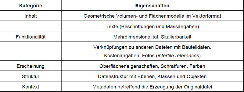 Die hier aufgelisteten Eigenschaften bilden ein Minimum an Informationen und Funk- tionalitäten, das in den mit der Archivierung verbundenen Umwandlungsprozessen erhalten werden muss, um die genannten Benutzerbedürfnisse zu erfüllen. Auf andere Eigenschaften, wie z. B. die Formatierung der Textelemente, eine Versionierung der Vektormodelle u.a. kann verzichtet werden.