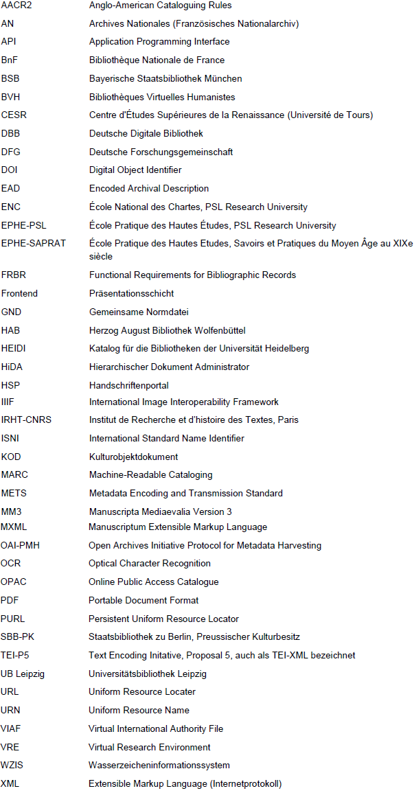 Mit dem Projekt Biblissima, welches 2012 begonnen wurde und 2019 seinen Abschluss finden wird, hat man in Frankreich ein Portal aufgebaut, dessen Zielsetzung eine ähnliche ist wie diejenigen des deutschen HSP. Man will ein «Observatoire de la culture écrite. schaffen, dass auf drei Sockeln ruht. Einerseits ist Biblissima eine Datenbank, welche den online Zugang zu Digitalisaten mittelalterlicher und frühneuzeit- licher Handschriften und Inkunabeln, welche in Frankreich aufbewahrt werden oder französischen Ursprungs sind, gewährleistet. Durch eine IIIF-Schnittstelle zur Anwendungsprogrammierung wird die Interoperabilität gewährleistet. Andererseits sind auch wissenschaftliche Beschreibungen und digitalisierte Handschriftenkataloge verfügbar.151 Dabei versteht sich Biblissima als Metakatalog, der dreissig unterschiedliche Online-Kataloge von verschiedenen Institutionen zusammenfasst. Die wichtigsten sind dabei die Bibliothèque virtuelle des manuscrits médiévaux des Institut de recherche et d’histoire des textes (IRHT-CNRS), das Kulturportal Gallica der BnF und die Bibliothèques Virtuelles Humanistes (BVH) des Centre d'Études Supérieures de la Renaissance (CESR) der Universität von Tours. 152 Weitere Partner sind das französische Nationalarchiv (AN), die École nationale des Chartes (ENC) und die