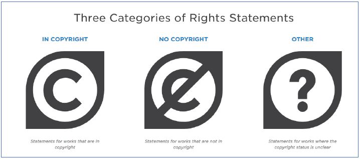 Un projet conjoint d’Europeana et de la Digital Public Library of America (DPLA) lancé en 2016, Rights Statements, offre un cadre standardisé de 12 déclarations englobant l’usage du matériel qui n’est pas soumis au droit d’auteur (ou ne l’est pas dans certaines juridictions) ou dont le statut n’est pas connu ; ces déclarations sont réservées à l’usage des institutions ainsi qu’aux plateformes d’agrégation de données online et ne sont pas des licences :45