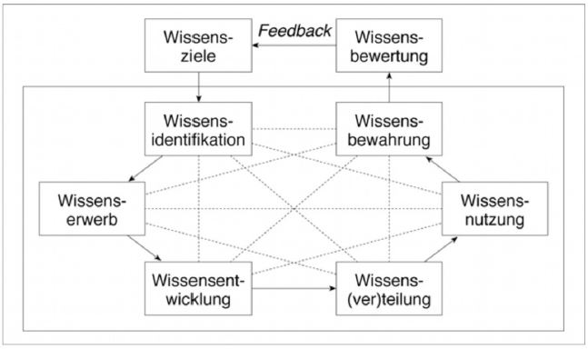 Gemäss diesem Modell ist zunächst wichtig, die Wissensziele einer Organisation zu definieren, d.h. festzustellen, welches Wissen entscheidend ist und deswegen erworben, aufbewahrt und geteilt werden soll. Da man nicht das ganze Wissen verwalten kann, ist die Identifikation und Analyse der grundlegenden Kernaufgaben not- wendig. Obwohl das vielleicht selbstverständlich scheint, wird dieser Schritt oft ver nachlässigt. Unternehmen, die keine klaren Ziele formuliert haben, haben in der Folge Schwierigkeiten, ein Wissensmanagementsystem zu implementieren und zu managen.