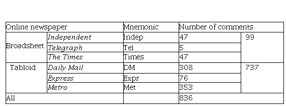 The readership of two of the tabloids (Daily Mail and Metro) posted considerably more actively than any of the other four online newspapers thus the distribution of the comments is not even among the six data sources. The uneven distribution of the comments posted to tabloids and broadsheets reflects the dynamism of the readership of the former. The unevenness, however, is not considered to distort the results of the present research since the pilot study, which included the analysis of approximately 50 evenly distributed immediate comments, exposed no balance along the broadsheet-tabloid divide in terms of the acceptance of the introduction of the neologistic pronoun.