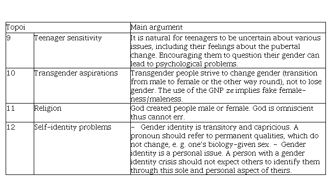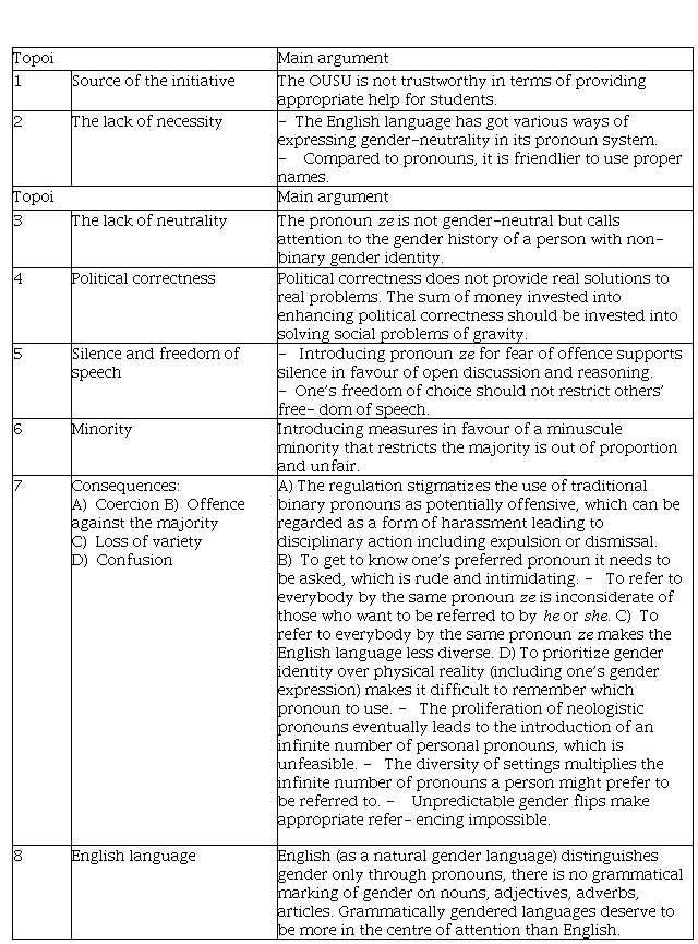 It is not only the number of arguments that differs greatly on the two planes, but the types of the argumentations show differences, too. Arguments in favour of the introduction of the GNP ze are based on kindness (1), equal rights activism (2), the trendiness of neophilia (3), confusing the concept of intersex with transgender (4), and mitigating the gravity of the issue (5). Arguments against the introduction of the GNP ze defame the source of the initiative (1), find the hauling of a well-functioning pronoun system without a sound reason destructive (2, 8), highlight that the neologism does not fulfil its function of neutrality (3, 7, 10), lean towards sensibility rather than political correctness (4), emphasize that the rights of the people in the community should not be harmed by the demanded interest of the minority (5, 6, 7), reveal the paradox of the coercive nature of a seeming recommendation (7), prefer physical reality over imaginary worlds (7), wish to remain practical (7), show concern for society and the healthy and natural development of teenagers (9), protect a shared culture of theism (11), are inclined to keep personal issues private rather than public (12), view identification to be reasonable through permanent rather than transitory and capricious qualities (12).