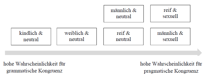 Je nach Merkmalskombination wird eine unterschiedlich starke Tendenz zu grammatischen bzw. pragmatischen Kongruenzformen erwartet. In Bezug auf das erwartete Kongruenzverhalten wurden die Merkmalskombinationen zuvor auf einem Kontinuum angeordnet (Abbildung 1).