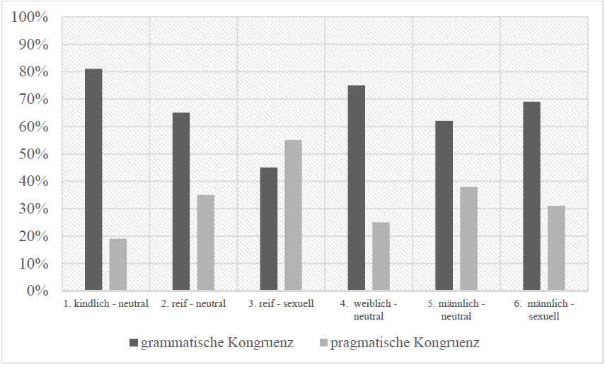 Obwohl das Mädchen in (7) als kindlich beschrieben wird und der Kontext nicht sexualisiert ist, entschieden sich 45% der Teilnehmenden für ein pragmatisch kongruierendes Pronomen. Eine mögliche Erklärung kann in der ungleichen Itemkonstruktion in Bezug auf die Agentivität liegen. Während in (7) MädchenSubjekt eines transitiven Verbes ist und somit ein höherer Grad an Agentivität vorliegt, findet sich in (8) ein intransitives Zustandsverb.3 Anders als bei bewusstem Abweichen von der Genus-Sexus-Kongruenz bei pejorativen Personenbezeichnungen besteht bei der Wahl eines neutralen Pronomens zwar grammatische Kongruenz zum Antezedens, jedoch nicht zur außersprachlichen Referenzperson. In Anlehnung an Nübling (2014a; b) könnte vermutet werden, dass das Neutrum in (8) gewählt wurde, um die Deagentivität und eventuelle Hilflosigkeit des Mädchens zu unterstreichen, während in (7) die Agentivität durch die pragmatische Kongruenz betont wird. Dieser Beobachtung sollte in einer weiteren Untersuchung nachgegangen werden.