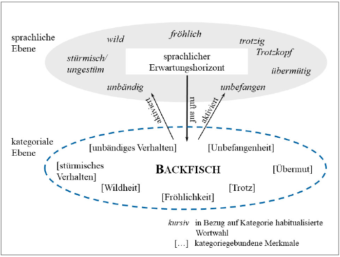 Gretes Sprung in die Luft, der eigentlich ein für junge Mädchen typisches Normalverhalten darstellt (cf. Stocker 2005: 140–145), wird dabei als klein und ungeschickt kommentiert. Damit erscheint ihr Emotionsverhalten als markierter Fall. Dies weist darauf hin, dass ‚dick‘ im kategorialen Referenzsystem des ausgehenden 19. Jahrhunderts mit den Zuschreibungen der Kategorie JUNGES MÄDCHEN nicht optimal korrespondiert. Grete, ein dickes Mädchen, ist zwar aufgrund ihres Alters ein junges Mädchen. Dass ihr Sprung in die Luft – obwohl eigentlich kategorietypisch – als klein und ungeschickt beschrieben wird, lässt sie hingegen als untypisches Kategoriemitglied erscheinen. Durch das Nicht-Vorhandensein der Eigenschaft ‚schlank‘ wird diese ex negativo als kategoriegebundene Zuschreibung bestätigt. Wie in Abbildung 1 am Beispiel der Bezeichnung und Kategorie Backfisch/BACKFISCH dargestellt, stehen Sprache und Kategorie im Prozess der Kategorisierung in einer dauernden Wechselbeziehung: Unabhängig davon, ob die zugehörige Kategoriebezeichnung (hier: Backfisch) explizit genannt wird oder nicht, rufen kategorietypische (kategoriegebundene) Ausdrücke die zugehörige Kategorie (hier: BACKFISCH) auf – sie vollziehen die Kategorisierung – und aktivieren weitere kategorietypische Versprachlichungen. Und umgekehrt eröffnen kategoriegebundene Zuschreibungen einen zur Kategorie gehörigen sprachlichen Erwartungshorizont, der sich punktuell in Kollokationen und Kookurrenzen verfestigt, wie sie z. B. Mehrwortbezeichnungen darstellen.