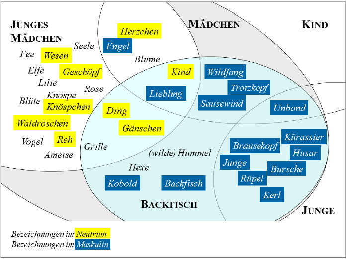 Jedoch ist Mädchen bzw. junges Mädchen nicht die einzige weibliche Bezeichnung im Neutrum. Zahlreiche weitere – meist metaphorische oder metonymische – Neutrum-Bezeichnungen wie Ding, Wesen, Geschöpf, Herz, Seelchen, Quecksilber, Juwel und auch Kind oder Fräulein werden habitualisiert für Mädchen verwendet (cf. Abbildung 2, gelb hinterlegt, bzw. Stocker 2005: 280–285). Darin zeigt sich: „Das Neutrum eignet sich zur Markierung […] nicht-geschlechtsreifer (Mädchen)“ (Kotthoff/Nübling 2018: 86).