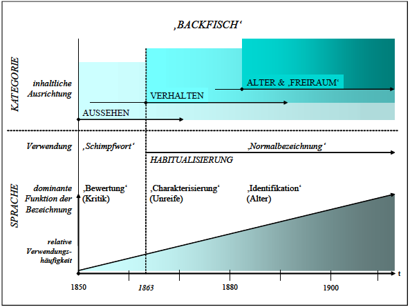 Während Backfisch um die Jahrhundertmitte nur selten vorkommt und wenn, dann in der Art eines Schimpfnamens (cf. Stocker 2005: 242), erlebt die Bezeichnung mit dem Erscheinen von Helms „Backfischchen’s [sic] Leiden und Freuden“ (1863) einen regelrechten Boom, wobei man im Kontext von Mädchenbüchern und Bezeichnungen mit Blick auf die habitualisierten Blumenbezeichnungen, das aber nur am Rande, treffender von einer Blüte sprechen müsste. Spätestens in den 1880er-Jahren ist Backfisch für Mädchen zwischen ca. 14 und 17 Jahren als‚ Normalbezeichnung‘ habitualisiert und fester Bestandteil des Bezeichnungssystems für weibliche Jugendliche. Semantik und Pragmatik der Bezeichnung bleiben von dieser Entwicklung nicht unbeeinflusst.
