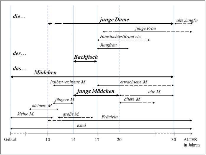Auch besteht mit der Bezeichnung altes Mädchen für ‚zu alte‘, d. h. ‚über die Zeit unverheiratet gebliebene‘ Mädchen eine antonymische Bezeichnung zu junges Mädchen.7 Die Existenz dieser Negativbezeichnung verweist auf eine starke deontische Komponente in der Semantik der Bezeichnung junges Mädchen, die sich mit ‚soll sich auf die Ehe vorbereiten‘ bzw. ‚soll sich verheiraten‘ umschreiben ließe (cf. Hermanns 2012c: 147–150). Das Mädchendasein bekommt damit ein Verfalldatum, was die Geschlechtsabstraktion durch das Neutrum bei Mädchen zusätzlich in den Vordergrund treten lässt. Jedoch gilt das Verfalldatum im 19. Jahrhundert nicht in gleicher Art für das Prädikat ‚jung‘, denn ein altes Mädchen wird durch Heirat zur jungen Frau. Heirat führt damit in zweierlei Weise zu einer Aufwertung der Frau: einmal, indem sie Genus-Sexus-Kongruenz herstellt, und einmal, indem sie ihr über das Adjektiv jung die Jugendlichkeit zurückgibt.