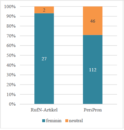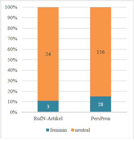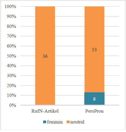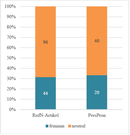 Die Ergebnisse zum Artikel und Pronominalgenus in der Lückentext-Methode in Abbildung 9 sowie im Videoexperiment in Abbildung 10 zeigen, dass das Femininum nur als Randerscheinung auftritt: In den Lückentexten sind 13,1% der Personalpronomen feminin, in den Videobeschreibungen 11,1% der Rufnamenartikel und 15,2% der Personalpronomen. Das Neutrum erweist sich damit auch als pronominales Defaultgenus.