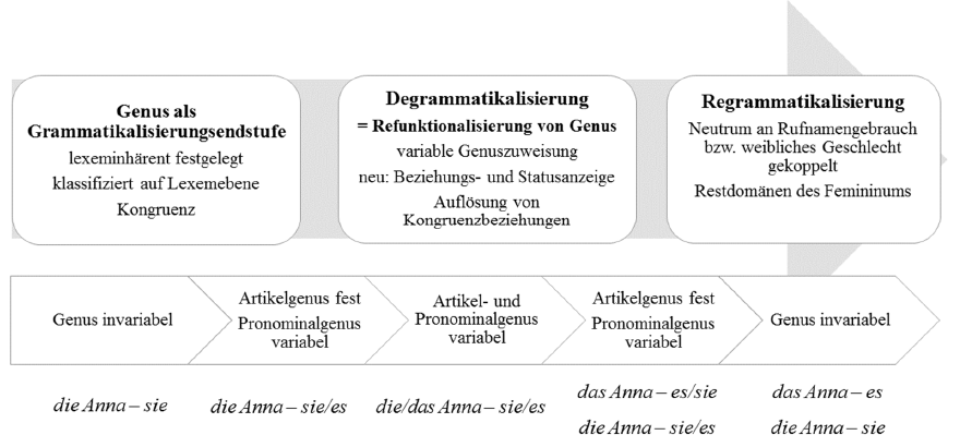 Dieser Prozess ist von den besonders autonomen Pronomen ausgegangen. Infolge der historisch frequenten Referenz auf Mädchen und unverheiratete Frauen über diminuierte Rufnamen sowie neutrale Lexeme wie Mädchen wurden neutrale Pronomen mit dem Konzept ‚weiblich, jung, unverheiratet, statusniedrig‘ assoziiert, das in Kontrast zum Femininum (‚weiblich, verheiratet, hoher Status‘) trat. Im Anschluss an die syntagmatische Hybridisierung nicht-diminuierter Rufnamen (die Anna . sie.es) konnte die soziopragmatische Genussteuerung auch die attributive Domäne erobern und das Artikelgenus erfassen (die.das Anna . sie.es). Damit hat Genus den Status einer grammatischen Vollkategorie erlangt.