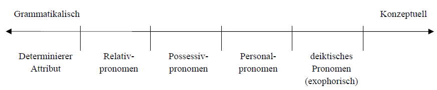 Die obige Kongruenzhierarchie ist um das Possessivpronomen erweitert, das Köpcke/Zubin zwischen Relativund Personalpronomen verorten. Außerdem wurde das deiktische Pronomen integriert. Damit zeigt sich, dass der genuslösende Konflikt anders als bei Corbett nicht im Nomen selbst angesetzt wird: Exophorische Pronomen beziehen sich exklusiv auf sprachexterne Elemente, womit ihr Genus nur referentiell gesteuert sein kann. Köpcke/Zubin (2009) (und Panther, s. u.) sprechen von „konzeptueller“ Kongruenz, da der Referent ein kognitives Konzept aufruft, das mit einem bestimmten Genus verknüpft ist (z. B. weiblich → f.). Auch das Genus anderer Targets kann konzeptuell zugewiesen werden (cf. Köpcke/Zubin 2009: 140). Je weiter man sich auf der Hierarchie nach rechts bewegt, desto wahrscheinlicher wird konzeptuelle Kongruenz.
