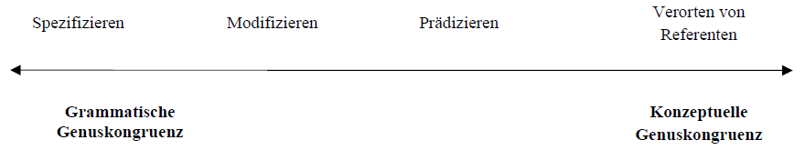 Diese pragmatische Interpretation der Corbett’schen Hierachie gründet auf der Annahme, dass konzeptuelle Genuszuweisung umso eher greift, je referentieller die Verweiskraft eines Targets ist. Artikel können Panther zufolge als spezifizierende Elemente die Identifikation des Referenzobjekts stützen, haben selbst aber keine referentielle Funktion. Damit kongruieren sie grammatisch. Modifizierer sind Attribute, auf die konzeptuelle Genuszuweisung ebenfalls nicht zugreift (*ein [n.] kleine [f.] Mädchen [n.]; cf. Panther 2009: 75).