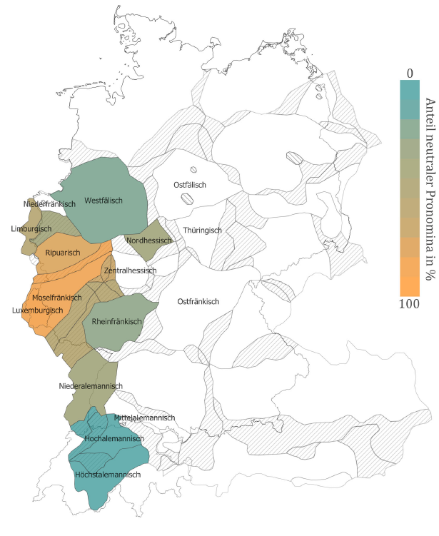 Die Daten stammen aus dem Online-Fragebogen.10 Mithilfe einer Multiple-Choice-Aufgabe wurde das Pronominalgenus bei Bezug auf die eigene Schwester erfragt, wobei feminine und neutrale Pronomen zur Wahl gestellt wurden. Der Karte liegen insgesamt 4.879 Datensätze aus ca. 1.800 Orten zugrunde. Der Anteil neutraler Pronomen variiert zwischen 2% (Hochalemannisch) und 97% (Luxemburgisch). Das Verbreitungsareal kann in drei Gebiete gegliedert werden, die sich durch die unterschiedliche Frequenz des Neutrums charakterisieren lassen. Am frequentesten ist es im Luxemburgischen, Moselfränkischen und Ripuarischen und in deren Übergangsgebieten (Gebiet 1). Im Rheinfränkischen und in Teilen des Niederalemannischen variiert die Frequenz des Neutrums stark in Abhängigkeit des jeweiligen Ortsdialekts (Gebiet 2). Im Schweizerdeutschen sind neutrale Pronomen vergleichsweise selten belegt (Gebiet 3).11
