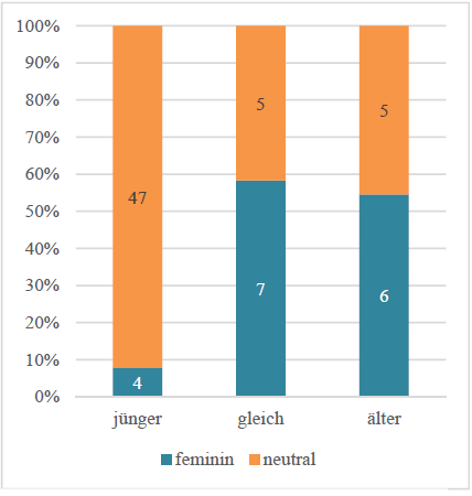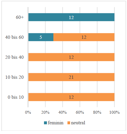Eine genauere Betrachtung der Genuszuweisung im Videoexperiment nach Referenzperson zeigt, dass die Restdomäne des Femininums ältere Frauen betrifft: In Bezug auf die älteste Frau „Maria“ (Mitte 70) sind 37,3% der Targets (Artikel19 und Personalpronomen) feminin, bei den jüngeren Protagonistinnen sind die Femininumanteile deutlich geringer („Emma“, ca. 4 Jahre: 1,2%; „Miriam“, Mitte 20: 10,3%; „Annette“, Mitte 50: 6,1%).