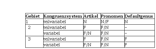 Es liegen variable und teilvariable Kongruenzsysteme vor. Konsistente Systeme, in denen die Targets weiblicher Rufnamen uneingeschränkt neutral sind (äquivalent zum Femininum im Standarddeutschen) finden sich nicht. Doch reicht das Luxemburgische durch seine hohe Neutrumfrequenz nah an ein solches System heran, nur in bestimmten Fällen können die Pronomen feminin sein. Teilvariable Systeme sind also solche, in denen der Artikel genusfest ist und das Geschlecht der Referentin anzeigt, das Pronomen aber aufgrund soziopragmatischer Steuerung variieren kann. Im Norden des Verbreitungsraums (Gebiet 1) ist der Artikel neutral, im Süden feminin (Gebiet 2 und 3). Inverse Systeme, in denen der Artikel variabel ist, Pronomen aber nicht, sind insgesamt seltener belegt.12 In Dialekten mit teilvariablem System ist meist ein Pronominalgenus der unmarkierte Default, während das andere auf spezifische Kontexte beschränkt ist. Diese Systeme weisen einen hohen (Re-)Grammatikalisierungsgrad auf, d. h. das Genus weiblicher Rufnamen festigt sich entweder zugunsten des Neutrums oder Femininums.