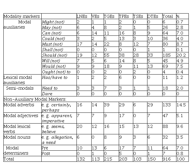 For this study, Downing/Locke’s (2006) approach to modality is adopted; the linguistic realisations, as provided by the duo, are presented below: