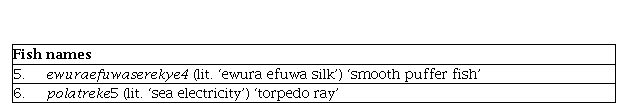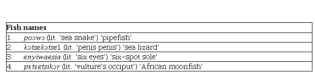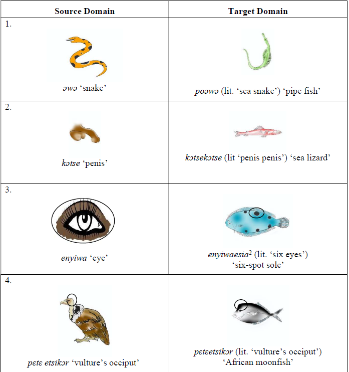 Specifically, the images of poɔwɔ (lit. ‘sea snake’) ‘pipe fish’ and kɔtsekɔtse (lit ‘penis penis’) ‘sea lizard’ are mapped onto the images of snake and penis via their cylindrical shapes whilst the circular and semi-circular shapes of parts of enyiwaesia (lit. ‘six eyes’) ‘six-spot sole’ and pεtεetsikɔr (lit. ‘vulture’s occiput’) ‘African moonfish’ trigger the mapping between the said fishes and the eye and the occiput of the vulture.