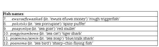 Fish names have been collected and discussed by archaeologists, linguists and marine biologists in Austronesian and Cree languages (Elbert 1972; Helfman/Randall 1973; Elameto 1975; Barnett 1978; Berkes/Mackenzie 1978; Akimichi/Sauchomal 1982; Randall/Egasta 1984; Tsuchida 1984). Concerning fishes from the African seas, Dobson (2004) and Kwei/Ofori-Adu (2005) discussed crabs and fishes. Dobson (2004) discussed freshwater crabs in Africa while Kwei/Ofori-Adu (2005) looked at the features of various fishes and also the names of the fishes in some local languages such as Ga, Ewe, Nzema and Mfantse.