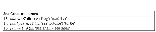 In the naming of some sea creatures, the Mfantse people consider many local features. At the perceptual level, they map the more than one features considered on the sea creatures onto another percept which has those features considered. Examples are the Mfantse names for toadfish, sea turtle and sea snail seen in Table 4.