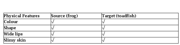 Table 5 shows multiple local features considered when naming the toadfish in Mfantse. Specifically, the frog-like head and wide lips of the toadfish trigger a perceived resemblance between it and a frog. The image of a toadfish is mapped onto the image of a frog under some features. Therefore, the metaphorical mapping is image or resemblance based. The term poatwεr (lit. ‘sea frog’) ‘toad fish’ basically says that the fish in question is carved in the likeness of a frog. This metaphoric name falls in the domain of image metaphors because there is a one onto one image mapping between the frog and the toadfish. Let us consider in Table 6, the metaphoric mapping between the sea turtle and a tortoise.