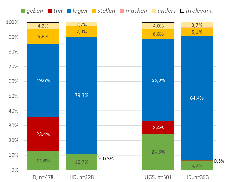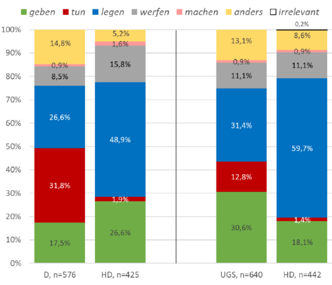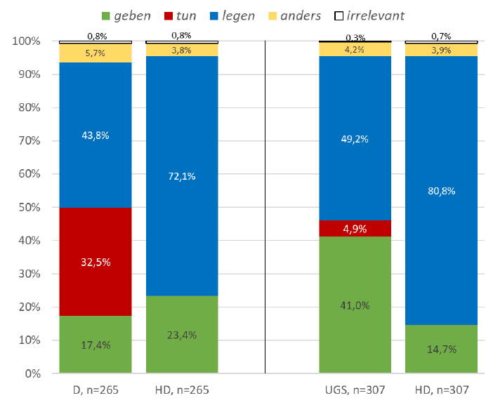 Ein Vergleich von Dialektund Standardsprachdurchgängen des Experiments deckt auch offensichtliche vertikale Präferenzen der beiden Basisverben geben und tun auf, wobei tun fast ausschließlich in den dialektalen Registern auftritt, während geben vor allem – aber nicht nur – in den standardsprechsprachlichen Szenenbeschreibungen verbalisiert wird. Vor dem Hintergrund der Fragebogenergebnisse aus Lenz et al. 2021 (cf. auch oben), erscheint diese (relative) Eindeutigkeit der Verbverteilungen auf die varietätenspezifischen Experimentdurchgänge insofern etwas unerwartet, als die besagten Fragebogenergebnisse zeigen, dass geben auch in den ostmittelbairischen Dialekten häufig als mögliche Dialektvariante und sogar von etwa einem Drittel der jüngeren Gewährspersonen als „natürlichste Variante“ (Lenz et al. 2021: Karte 9) anstelle von tun eingestuft wird. Bezüglich der vertikalen Einordnung der Basisverben gebenund tun mit PUT-Semantik zeigen die Sprachgebrauchsdaten aus den Experimenten somit eindeutigere Ergebnisse, als es die subjektiven Einschätzungen der Gewährspersonen offenlegen. Diese ersten Beobachtungen bedürfen natürlich weiterer empirischer Vertiefungen.