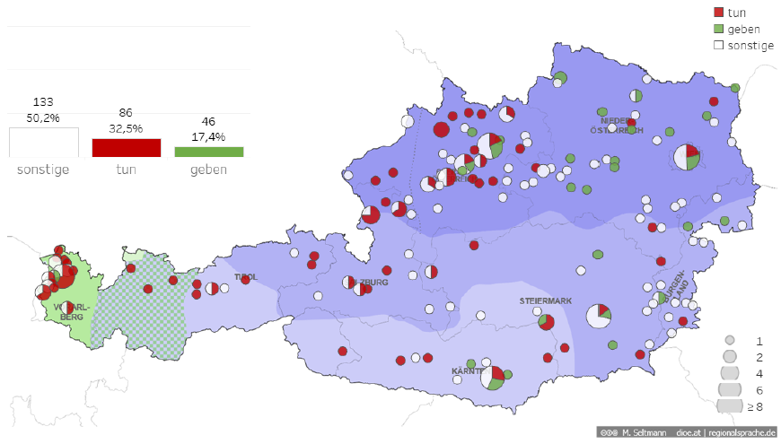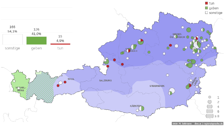 Vertikal-sozial ist geben vor allem im oberen Bereich des vertikalen Spektrums der DialektStandard-Achse vorzufinden, während tun eindeutig den Nonstandard und hier die dialektal(er)en Register markiert. In areal-horizontaler Hinsicht ist tun mit PUT-Semantik dialektal in Gesamtösterreich, seltener aber im Osten Österreichs verbreitet, während geben in dialektalen wie „mittleren“ Registern vor allem im Ostmittelbairischen sowie im Osten des Südmittelbairischen und Südbairischen mit tun konkurriert. In standardsprachliche(er)en Spektrenausschnitten ist geben hingegen regionenübergreifend eindeutig das frequentiell im Sprachgebrauch dominierende und in der Spracheinstellung präferierte Basisverb der zielorientierten Objektsbewegung.