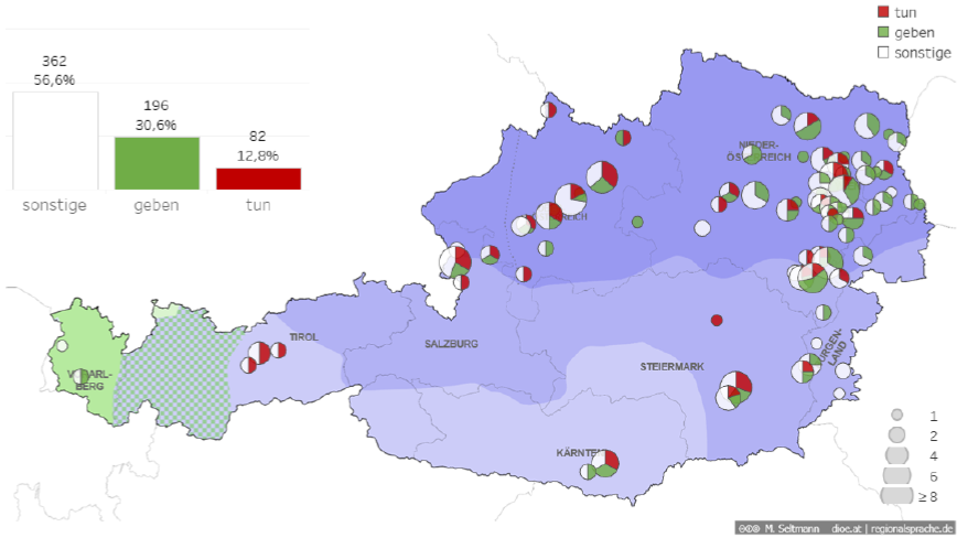 „umgangssprachlich“ das dominierende Basisverb im östlichen Ostmittelbairischen, während seine Frequenzen zugunsten von tun gegen Westen hin kontinuierlich abnehmen. Im südmittelbairischen Übergangsgebiet, für das nur wenige Daten „umgangssprachlich“ vorhanden sind, deutet sich in den städtischen Regionen Graz und Salzburg in der Bewertungsaufgabe (siehe Abbildung 12) noch eine Kookkurrenz von geben und tun an, die auch für Klagenfurt im östlichen Südbairischen beobachtet werden kann; in der Produktionsaufgabe (siehe Abbildung 11) dominieren in den drei genannten städtischen Räumen hingegen bereits geben-Belege. Für Tirol ist aufgabenübergreifend nur tun als Basisverb belegt. Für Vorarlberg liegen zu wenige „umgangssprachliche“ Fragebogendaten vor, um Tendenzen zu formulieren.