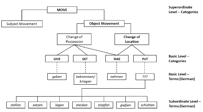 Während SprecherInnen des Deutschen zur Versprachlichung von quellorientierten Positionierungen (TAKE-Aktionen) auf ein Basisverb zurückgreifen können (siehe oben nehmen), wird diese Systemposition für zielorientierte Positionierungen (also für PUT-Aktionen) in der Forschungsliteratur in der Regel als unbesetzt dargestellt (cf. Fagan 1991; Berthele 2012; Hermann 2019; De Knop 2016). Um auf zielorientierte Positionierungen zu referieren, stellt das Deutsche varietätenübergreifend Spezifizierungsverben zur Verfügung, die auf Handlungskategorien einer untergeordneten Kategorienebene verweisen (siehe Abbildung 1). Zum lexikalisch-semantischen Netzwerk deutschsprachiger PUT-Verben gehören etwa die Spezifizierungsverben stellen, setzen, legen, schütten, gießen, stopfen oder stecken. Welches Spezifizierungsverb zur Verbalisierung welcher Objektsbewegung genutzt werden kann, ist insbesondere abhängig von der Form des Objekts (z. B. rund versus eckig), seiner Konsistenz (z. B. flüssig versus weich versus fest) oder der Art und Weise seiner Position am Zielpunkt der Objektsbewegung (cf. Fagan 1991; Berthele 2012; De Knop 2016; Hermann 2019; Lenz et al. 2021; Lenz (im Druck)). Während etwa legen impliziert, dass ein Objekt in eine Art liegende Position gebracht wird (z. B. ein Buch (auf seine(r) Vorder-/Rückseite) ins Regal legen), referiert stellen auf eine Art aufrechte Positionierung (z. B. ein Buch (aufrecht) ins Regal stellen). Setzenhingegen deutet an, dass das Objekt in eine Art sitzende Position gebracht wird (z. B. einen Hut auf den Kopf setzen). Schütten oder gießen sind in der Regel auf granulare oder flüssige Substanzen beschränkt (z. B. Wasser in ein Glas schütten); stopfen und stecken heben indes das Umhülltsein des Objekts an seinem Zielort hervor (z. B. ein Tuch in einen Auspuff stopfen).
